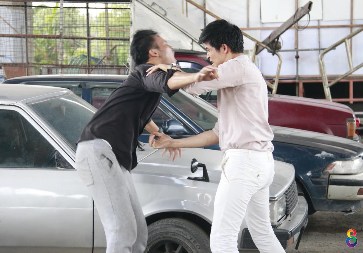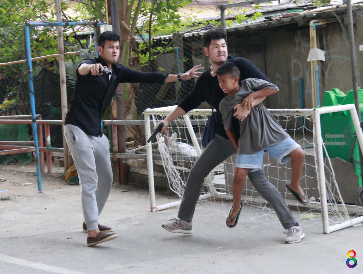 เป็นฉากที่ ผู้กองคำรบ (บอส-พุทธิพงษ์) ชวน หมอวงศกร (ตูมตาม) มารักษาคนในชุมชนฟรี แต่อยู่ๆ กลับเจอคนร้ายหนีตำรวจมาจับเด็กเป็นตัวประกัน เบอะ (แซนดี้) เห็นเหตุการณ์เข้า ก็อยากช่วยผู้กองคำรบ จังหวะที่เบอะจะเอาไม้ฟาดหัวคนร้าย หมอวงศกรเตะโกนเรียกเบอะ คนร้ายหันมาเห็น เลยเอาด้ามปืนตีเข้าที่หัวแซนดี้จนแตก หมอวงศกรรีบเข้ามาช่วย สู้กับโจรจนฝุ่นตลบ