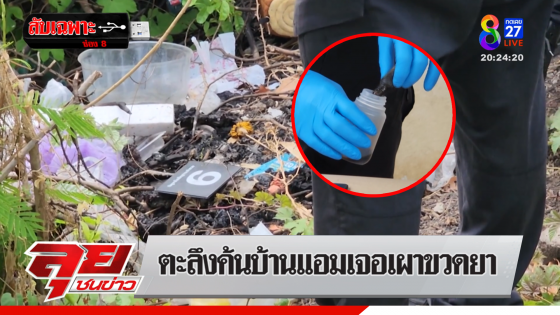 ตำรวจและเจ้าหน้าที่พิสูจน์หลักฐาน เข้าตรวจค้นบ้านแอม ที่กาญจนบุรี พบขวดแก้วบรรจุน้ำยาสีดำถูกเผาหลังบ้าน ขณะที่ รองผู้กำกับฯ สามีแอม ร่วมสังเกตการณ์ หากแอมทำผิดอยากให้รับสารภาพ